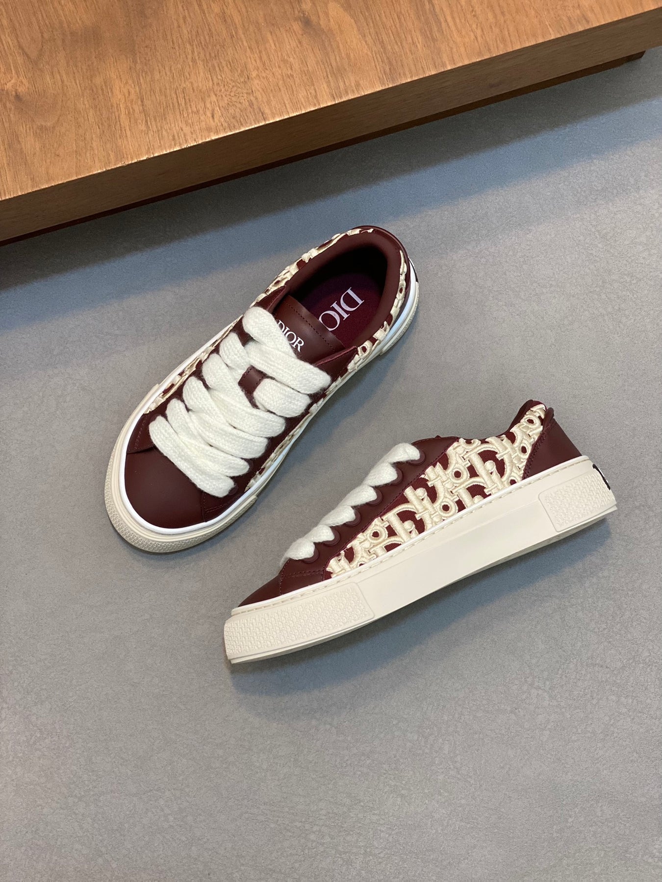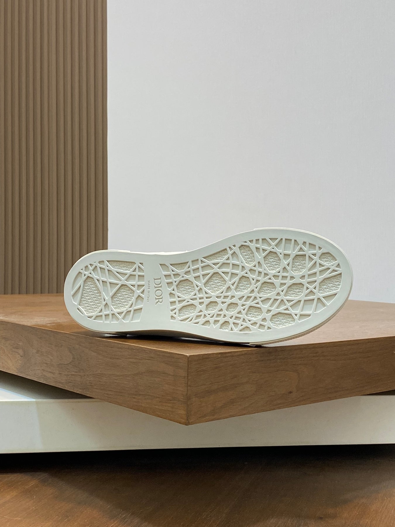 The thick low-top design features a durable embossed rubber sole, offering stability, comfort, and excellent wear resistance. The side showcases a subtle embossed “Di~r” logo, highlighting brand recognition and refined style.