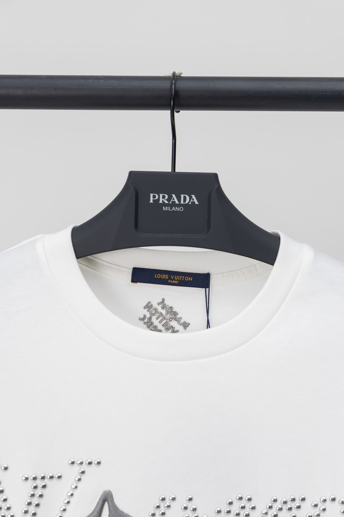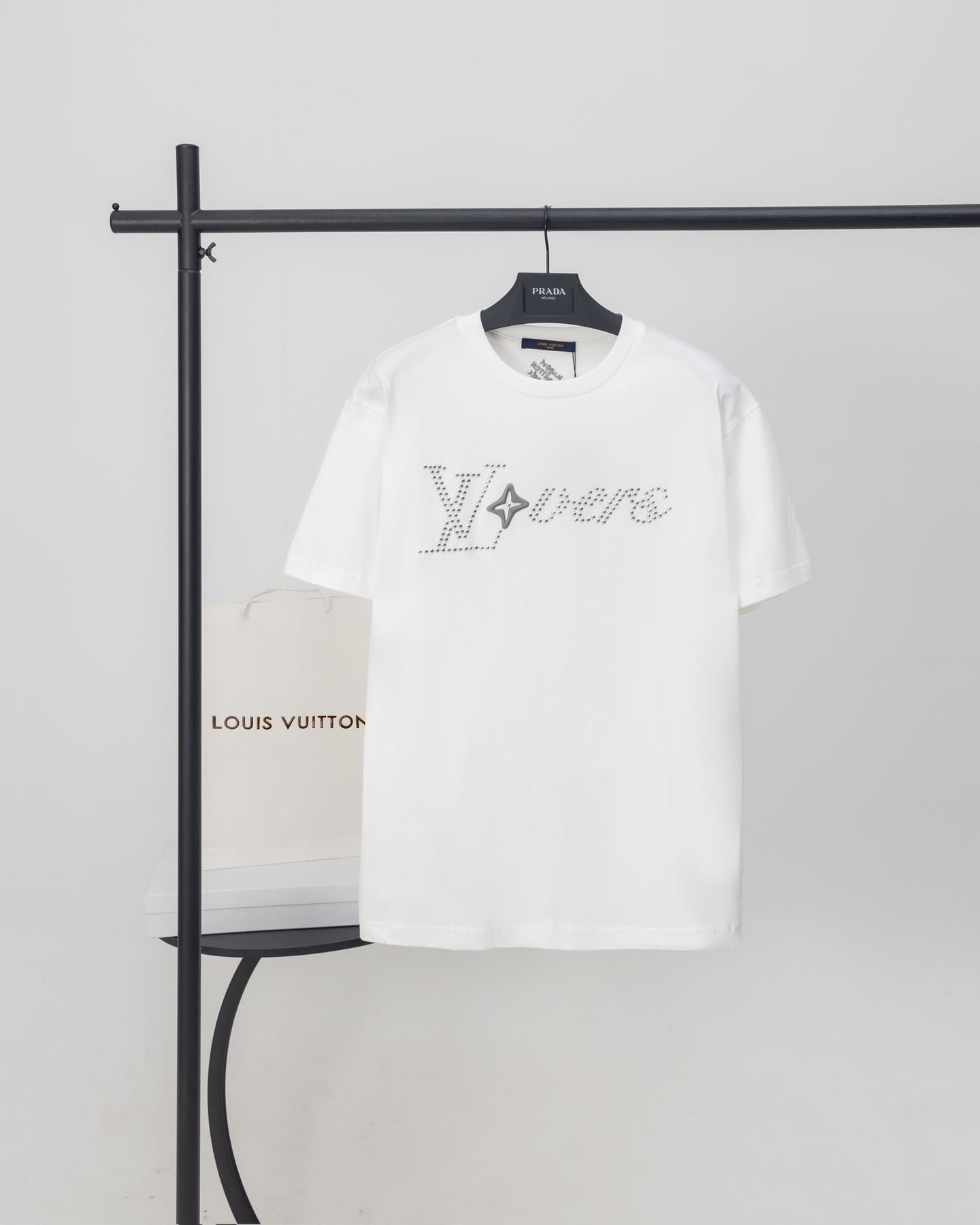 Elevate your style with the Louis Vuitton 2024SS Phi-Dieu T-Shirt, featuring exquisite rhinestone and stud embroidery for a luxurious finish. Crafted from 260g 32-count double yarn cotton, this tee is ultra-soft, durable, and retains its shape, offering a premium alternative to ordinary market versions.