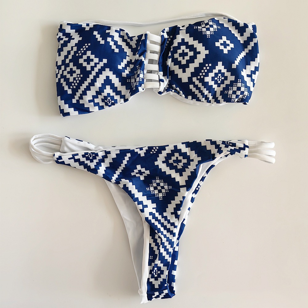 跨境爆款蓝色印花女士泳装三点式分体性感海边沙滩度假泳装bikini